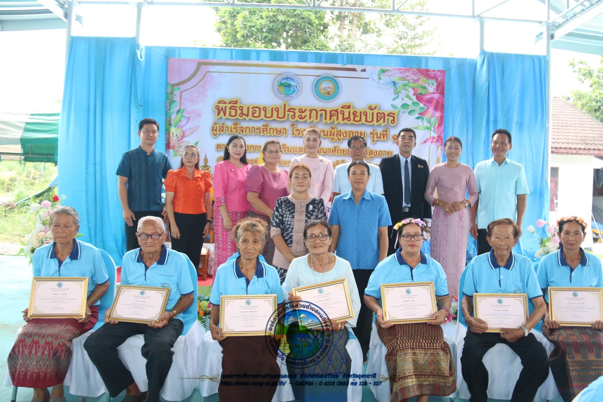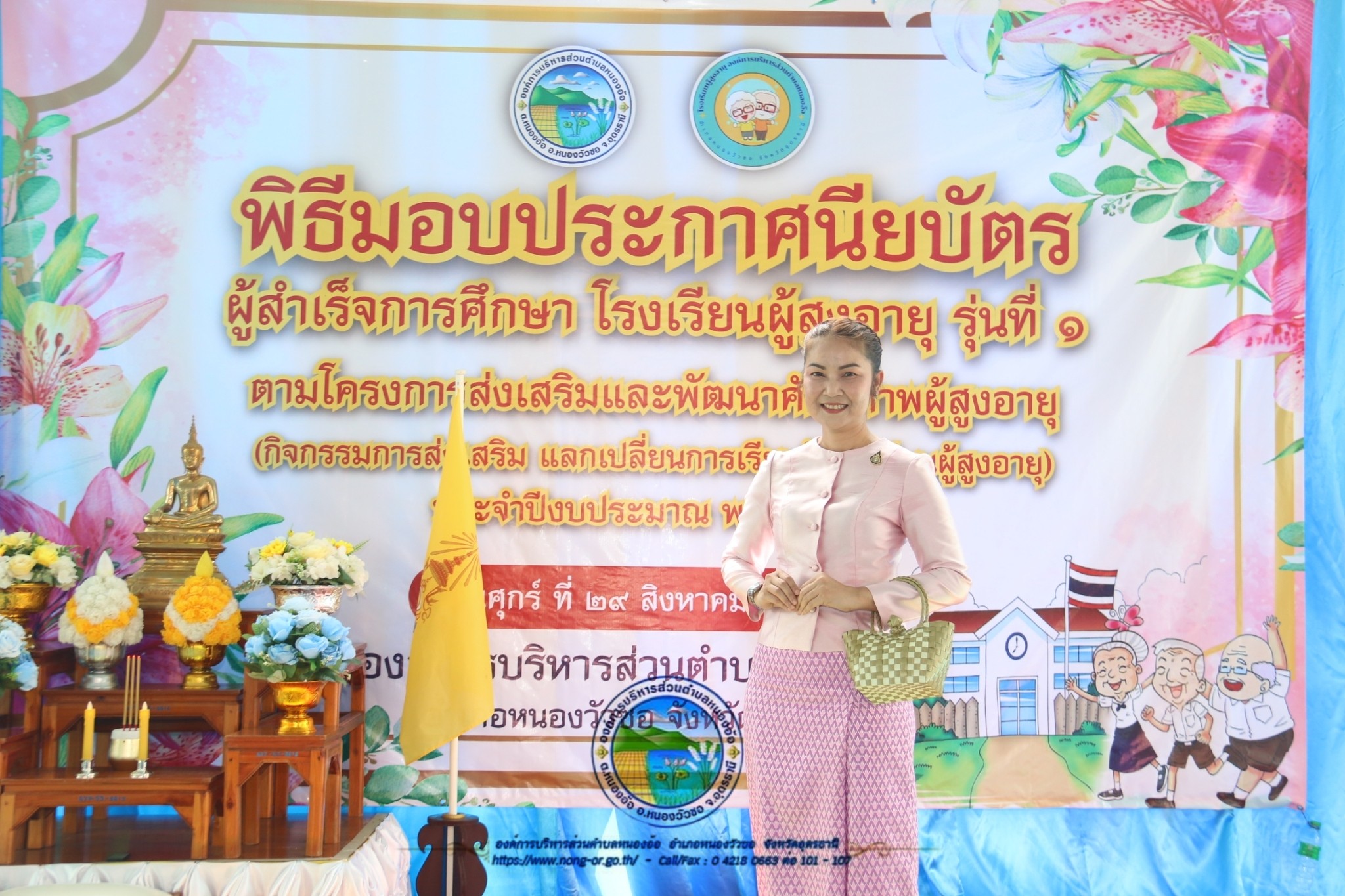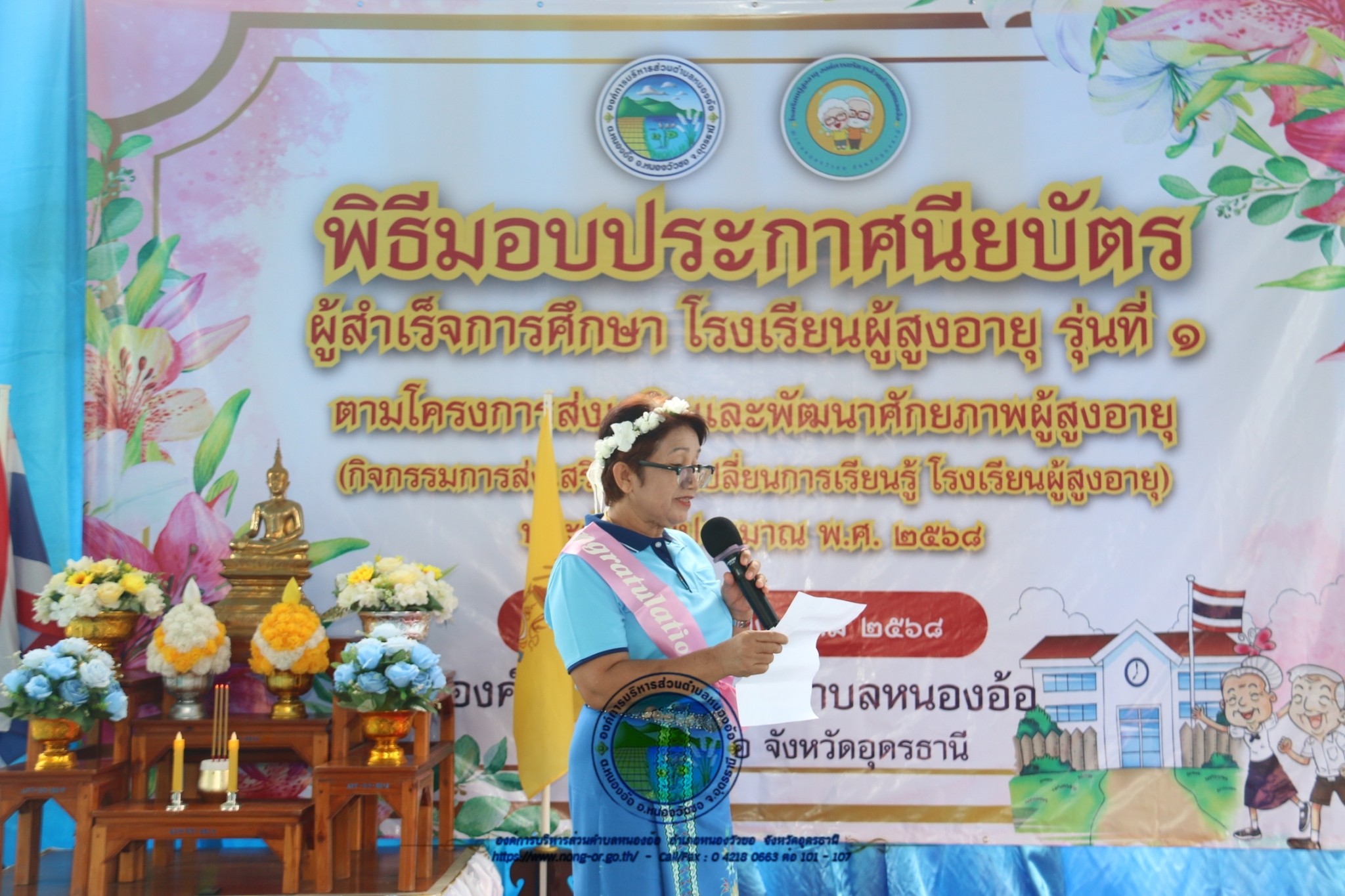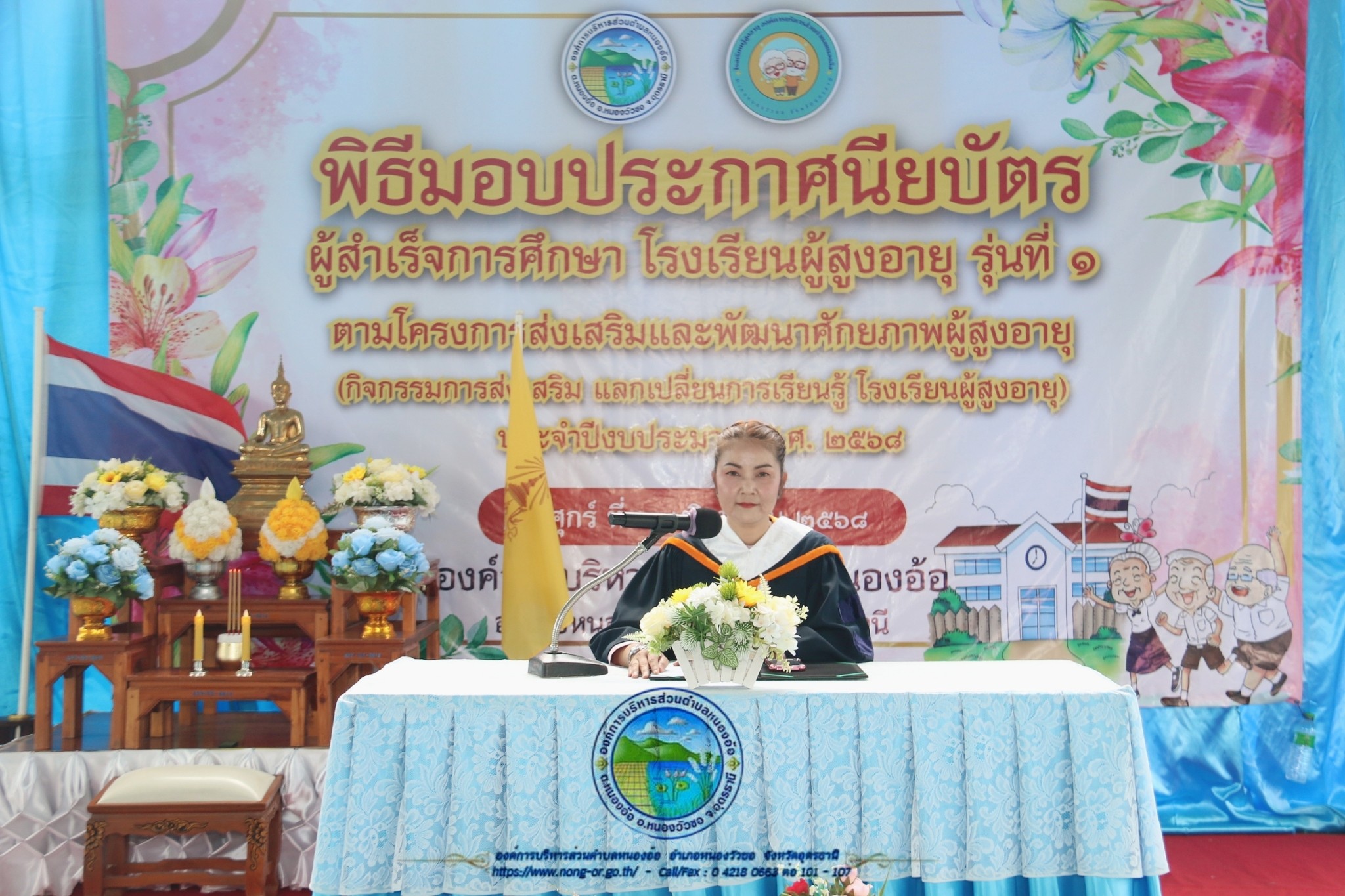 นางสาวสุมาลี พานิช นายกองค์การบริหารส่วนตำบลหนองอ้อ เป็นประธานในพิธี พร้อมด้วย คณะบริหาร, คณะสภาฯ, ปลัด, รองปลัด, หัวหน้าสำนัก, ผู้อำนวยการกองคลัง, ผู้อำนวยการกองช่าง, ผู้อำนวยการกองการศึกษา, เจ้าหน้าที่และพนักงานองค์การบริหารส่วนตำบลหนองอ้อ รวมไปถึง ผู้นำชุมชนผู้นำหมู่บ้าน และผู้สูงอายุในเขตตำบลหนองอ้อ เข้าร่วมพิธีรับใบประกาศนียบัตรผู้สำเร็จการศึกษาโรงเรียนผู้สูงอายุ ตามโครงการส่งเสริมการพัฒนาศักยภาพผู้สูงอายุ (กิจกรรมการส่งเสริมแลกเปลี่ยนและการเรียนรู้โรงเรียนผู้สูงอายุ) ประจำปีงบประมาณ พ.ศ ๒๕๖๘