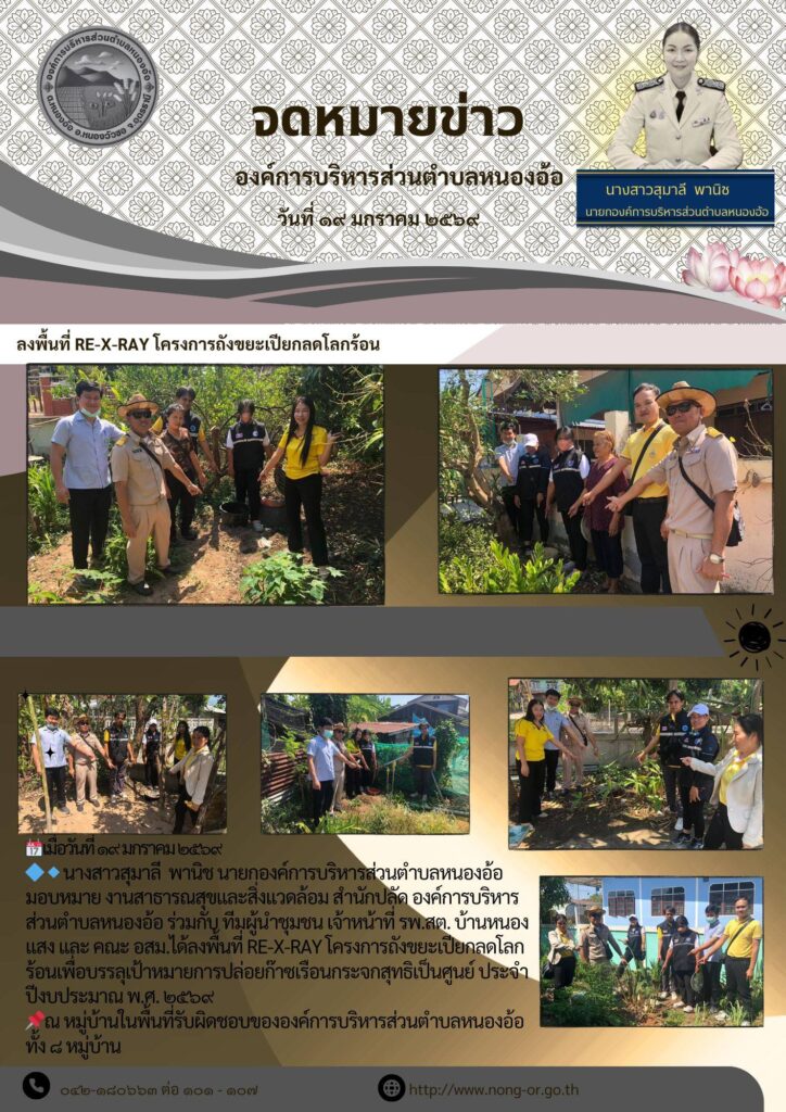 นางสาวสุมาลี พานิช นายกองค์การบริหารส่วนตำบลหนองอ้อ มอบหมาย งานสาธารณสุขและสิ่งแวดล้อม สำนักปลัด องค์การบริหารส่วนตำบลหนองอ้อ ร่วมกับ ทีมผู้นำชุมชน เจ้าหน้าที่ รพ.สต. บ้านหนองแสง และ คณะ อสม.ได้ลงพื้นที่ RE-X-RAY โครงการถังขยะเปียกลดโลกร้อนเพื่อบรรลุเป้าหมายการปล่อยก๊าซเรือนกระจกสุทธิเป็นศูนย์ ประจำปีงบประมาณ พ.ศ. ๒๕๖๙